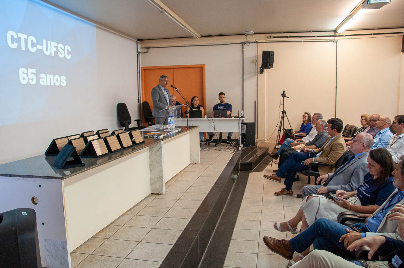 O encontro foi marcado por homenagens a ex-diretores que lideraram o centro entre 1960 e 2024, bem como a docentes e técnicos-administrativos aposentados em 2025 – gerações que ajudaram a construir esta história. Ex-dirigentes e representantes de instituições parceiras fundamentais para o ecossistema de inovação catarinense também se manifestaram, entre elas a Fundação de Ensino e Engenharia de Santa Catarina (Feesc), a Associação Catarinense de Tecnologia (Acate) e o Conselho Regional de Engenharia e Agronomia de Santa Catarina (CREA-SC).